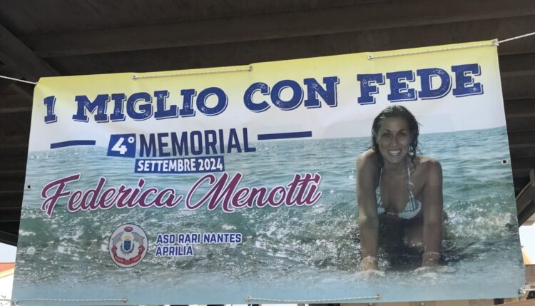 DOMENICA 8 Settembre 2024 si e’ svolto il 4*Memorial ” Un miglio con FEDE”, in ricordo dell’atleta apriliana Federica Menotti, scomparsa prematuramente cinque anni fa durante un allenamento in piscina. Una giornata all’insegna dello sport, partecipazione e condivisione di valori svoltasi presso lo stabilimento balneare “Mene’ Acquariva” di Tor San Lorenzo Ardea. Circa 100 gli atleti partecipanti di diverse categorie delle societa’ sportive come la Rari Nantes, l’Acquateam Latina A.S.D. Team Master Lavinio, C.D.S., Polisportiva Vigor Perconti, Villa York Sporting club SSD, AB Team ASD, Circolo Tennis