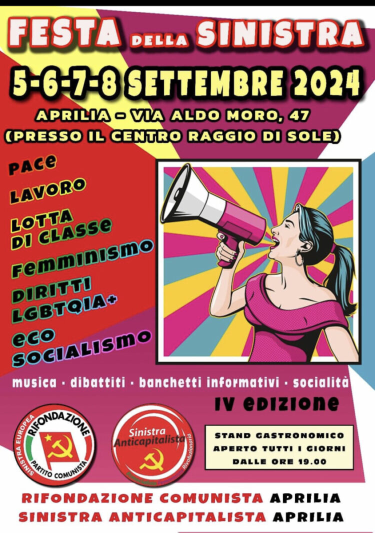 Aprilia – 4 giorni di dibattiti, politica, buona musica e ottimo cibo. FESTA DELLA SINISTRA – IV edizione 5-6-7-8 settembre 2024. La 4 giorni di festa andrà in scena in Via Aldo Moro 47.
