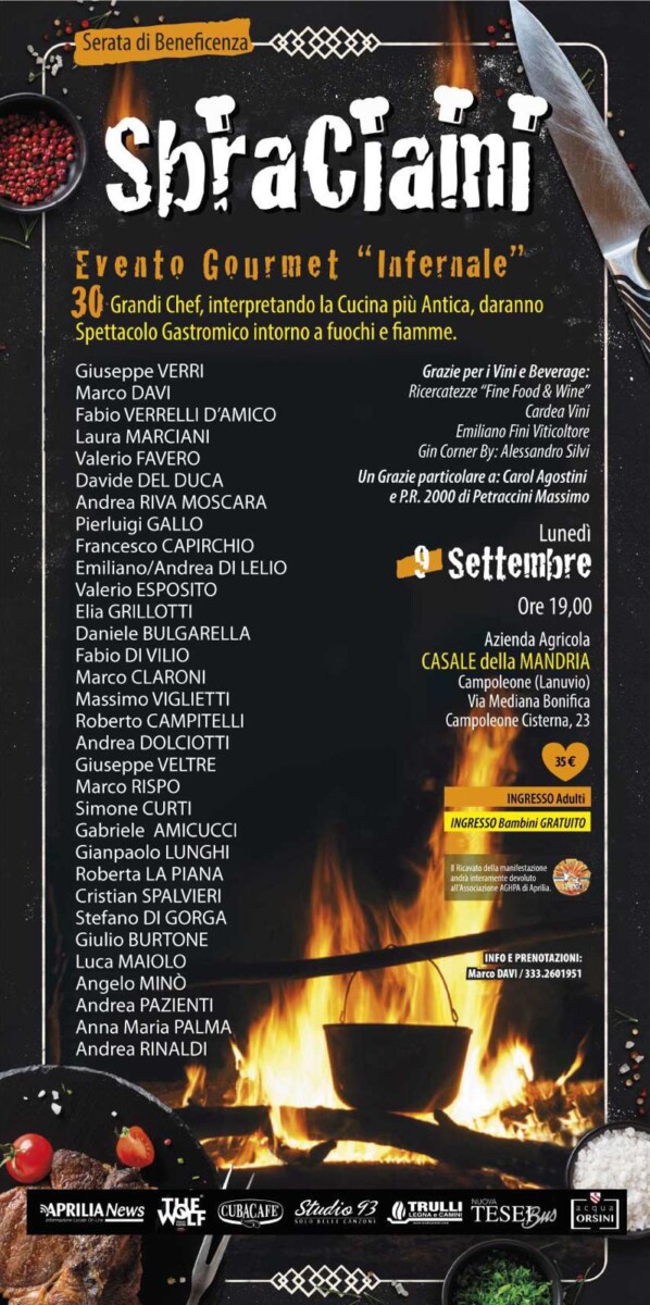 Aprilia – Sbraciami. Torna in città l’evento gourmet più infernale dell’anno. Andrà in scena lunedì 9 settembre dalle ore 19, come da tradizione, presso l’azienda agricola Casale della Mandria, nello storico borgo di Campoleone in via Mediana Bonifica 23. 30 grandi chef, sono annunciati alla serata anche alcuni chef stellati, interpretando la cucina più antica, daranno spettacolo gastronomico intorno a Fuochi e fiamme.