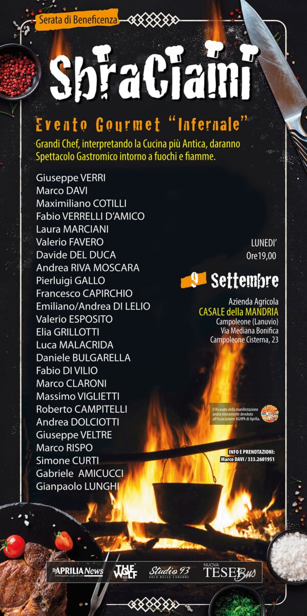 Aprilia – Sbraciami. Torna in città l’evento gourmet più infernale dell’anno. Andrà in scena lunedì 9 settembre dalle ore 19, come da tradizione, presso l’azienda agricola Casale della Mandria, nello storico borgo di Campoleone in via Mediana Bonifica 23. Una squadra di grandi chef, sono annunciati alla serata anche alcuni chef stellati, darà fondo a tutte le tradizioni culinarie dando vita ad un vero e proprio spettacolo gastronomico tra fuochi e fiamme.