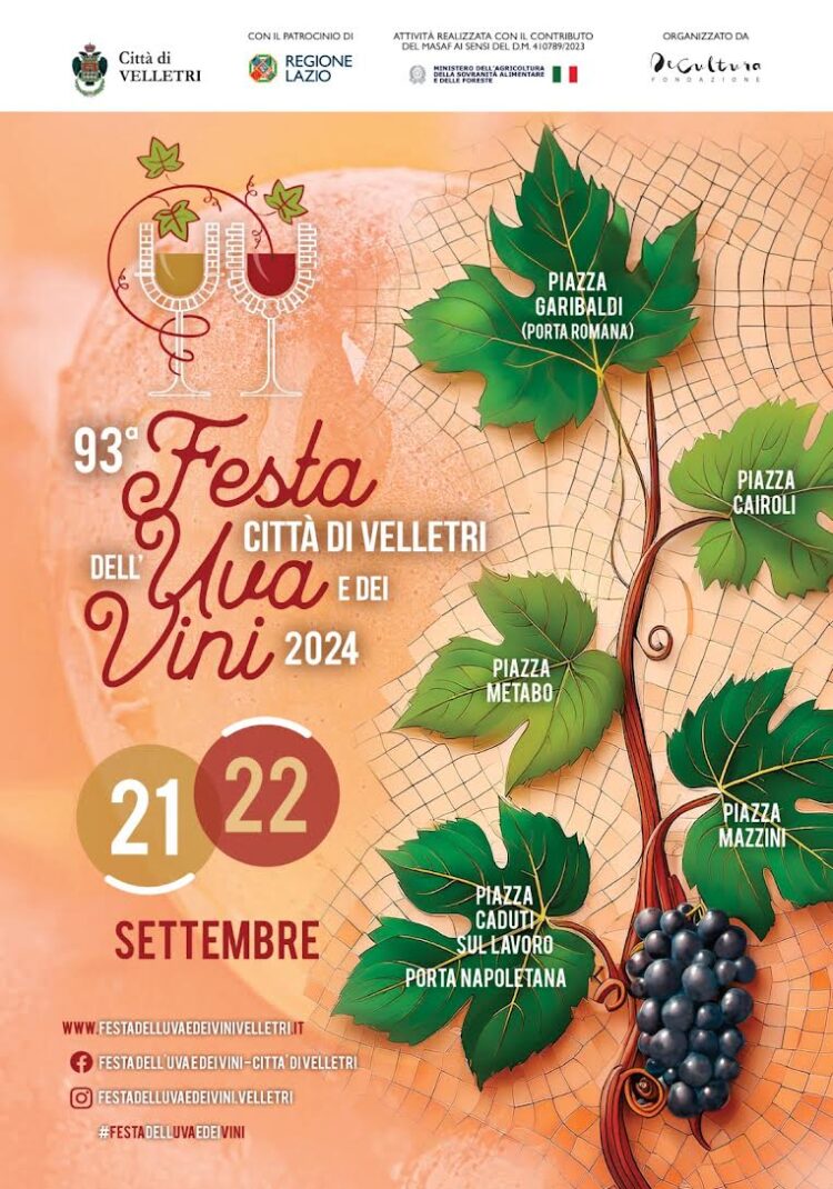 Finalmente ufficiale la data della 93esima edizione della Festa dell’Uva e dei Vini, un’esplosione di colori, sapori ed eventi culturali e enogastronomici che invaderà il centro storico di Velletri sabato 21 e domenica 22 settembre 2024. La manifestazione, organizzata dalla Fondazione De Cultura, è patrocinata dal Comune di Velletri e dalla Regione Lazio, nonché dal Ministero dell’Agricoltura, Sovranità Alimentare e Foreste.