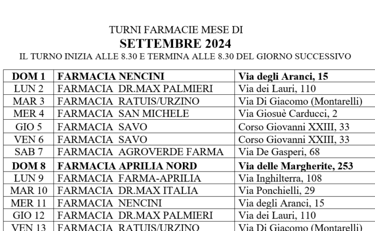 I turni di Settembre delle farmacie di Aprilia. In allegato il documento con indirizzi e turnazioni delle farmacie di Aprilia. Turni festivi e rotazioni domenicali per tutto il mese di settembre. Il documento è facilmente scaricabile e consultabile. Lo si può conservare e consultare nel momento del bisogno.
